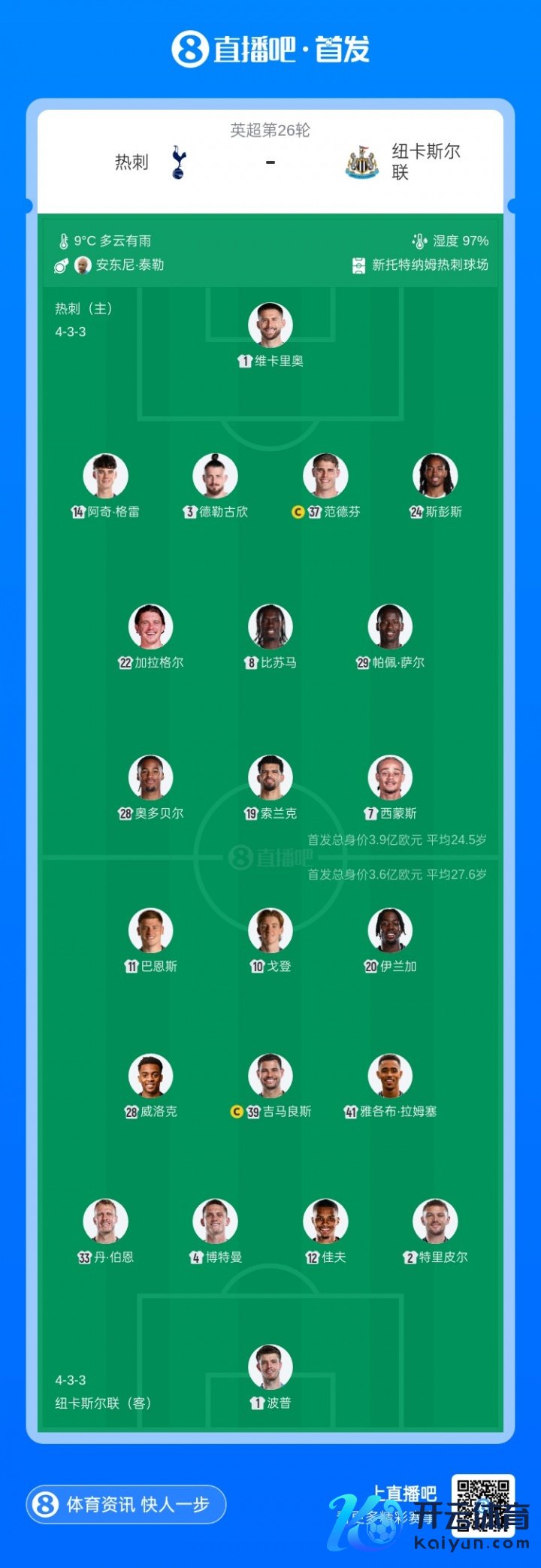 2月11日讯 北京技术2月11日3:30,英超第26轮,热刺vs纽卡。赛前两边公布了本场比赛的首发名单。