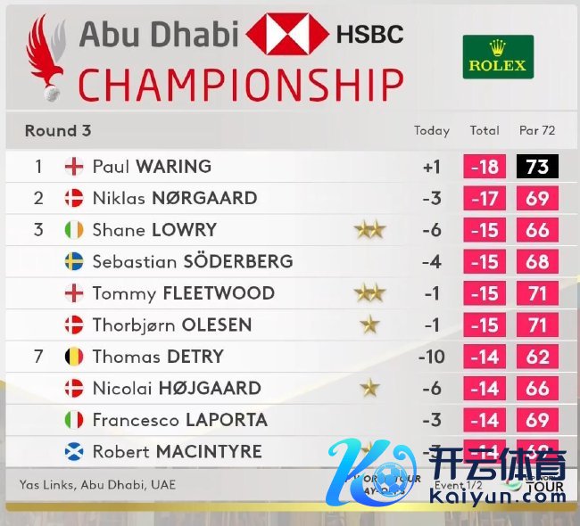 丹麦选手尼可拉斯-诺亚格(Niklas Norgaard)与保罗-华林同组临了动身,持到4只小鸟,包括10号洞推入22英尺长推持鸟,吞下1个柏忌,打出69杆,三轮199杆(65-65-69),低于模范杆17杆,名挨次二位。