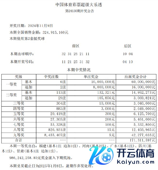 本期天下共开出6注一等奖,单注奖金1000万元,其中2注礼聘追加,多得奖金800万元,2注追加头奖出自分落福建、甘肃。另外4注基本头奖落于河南(2注)、广东、四川。二等奖开出113注,单注奖金13.2万余元,其中29注收受追加投注,每注多得奖金10.5万余元。本期大乐透天下销量为3.24亿元,奖池方面,9.86亿余元滚存至11月11日(周一)开奖的第24131期。