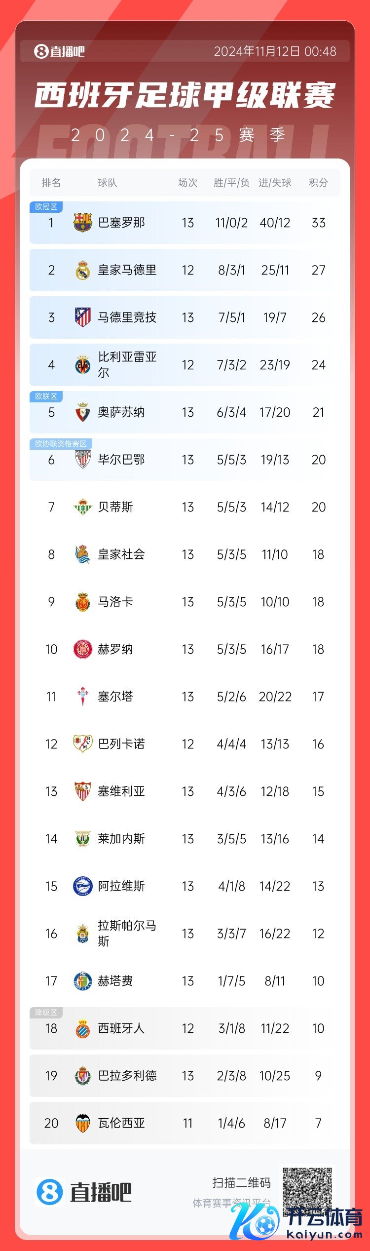 11月12日讯 《逐日体育报》列出本赛季若是莫得VAR情况下的西甲积分榜,巴萨、皇马、马竞名次前三。