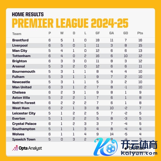 11月13日讯 Opta统计了本赛季英超各队在主场拿到的积分,比肩出主场积分榜,布伦特福德16分居首,利物浦15分次席。