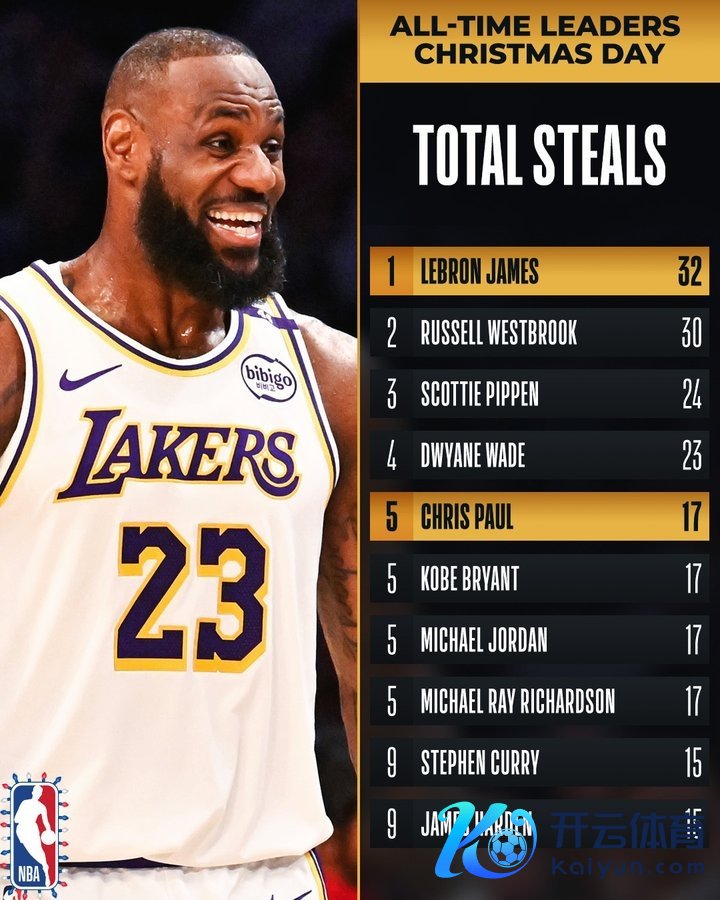 今天事后,在圣诞大战抢断榜中,詹姆斯32次力压威少升至第一;保罗17次与科比、乔丹和迈克尔-雷-理查德森比肩第五。