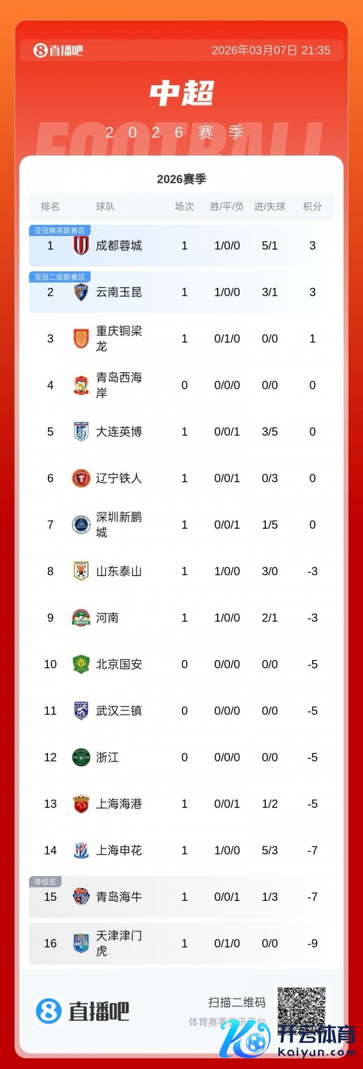 03月07日讯 中超首轮适度前6场比赛的较量,最新积分榜如下。来日本轮临了两场,浙江vs青岛西海岸,三镇vs国安。