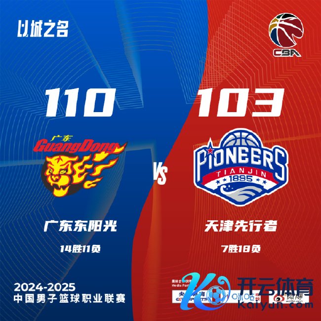 第三节,天津很快哀痛只差2分,但广东实时转念打出一波11-3再行跨越到两位数,后半节天津队再次发力迫近比分,广东86-80跨越。第四节,比赛参预尖锐化,两边围绕5分阁下的分差反复争夺,天津一度哀痛只差1分,要害时代杜润旺和徐杰指点投进三分奠定胜势,最终,广东男篮110-103打败天津男篮。